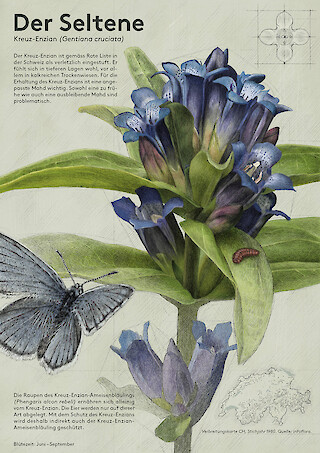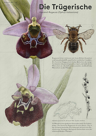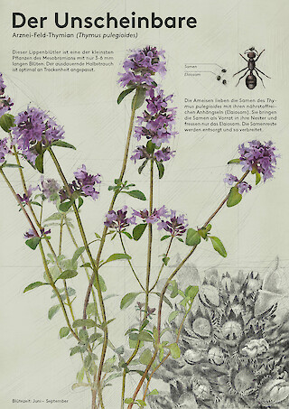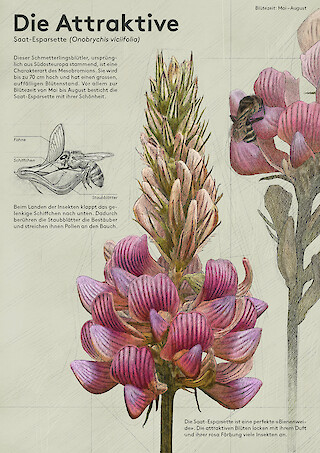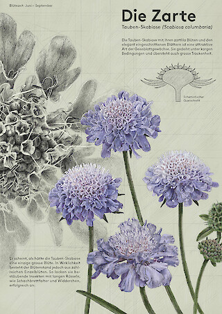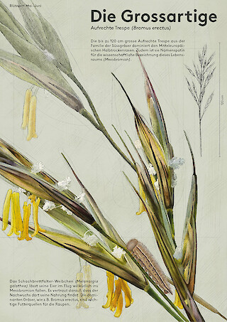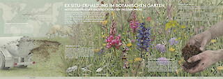 Eine dieser Ex situ-Kulturen - der Mitteleuropäische Halbtrockenrasen - entsteht im Botanischen Garten Bern. Die Schautafeln von Nina Schwarz führen durch diesen Lebens- und gleichzeitig Erholungsraum, bringen Besucher*innen die Bedeutung dieses Schutzkonzepts und der einzelnen Pflanzenarten auf eine sensible und ästhetische Weise näher und fördern so die Wertschätzung für natürliche Lebensräume.